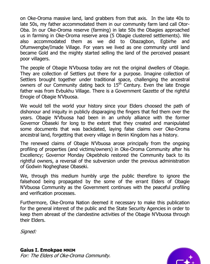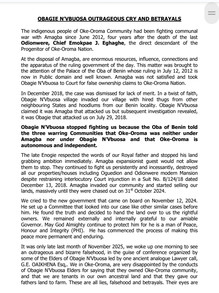 “It was only late last month of November 2025, we woke up one morning to see an outrageous and bizarre falsehood, in the guise of conference organized by some of the Elders of Obagie N’Vbuosa led by a lawyer. We in Oke-Oroma, are very disappointed by the conducts of Obagie N’Vbuosa Elders for saying that they owned Oke-Oroma community, and that we are tenants in our own ancestral land and that they gave our fathers land to farm.