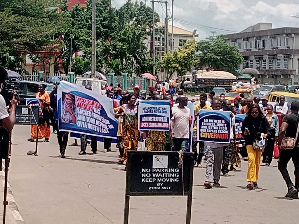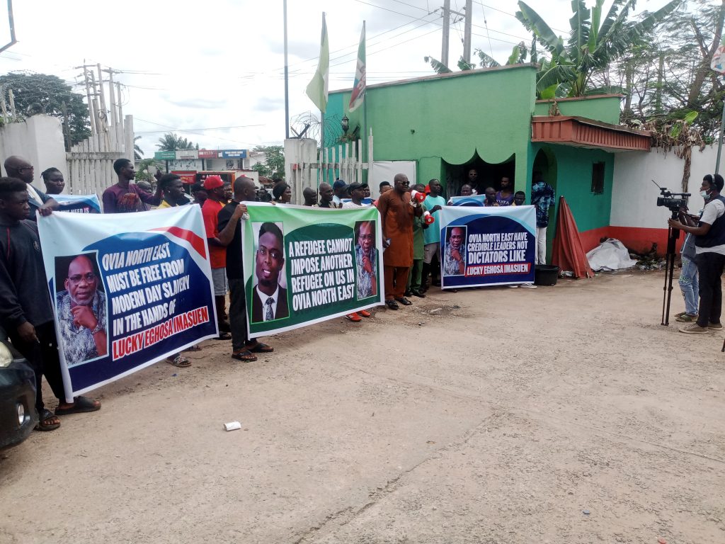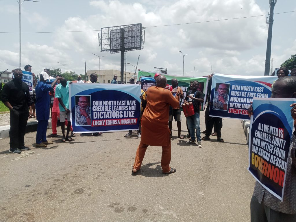 The group which assembled at Kings Square, Ring Road, Benin City protested through major streets in the Benin metropolis enroute the state secretariat of the APC at Ikponkpan Road, GRA, with different banners with inscriptions such as “Ovia North-East Have Credible Leaders Not Dictator Like Lucky Eghosa Imasuen”, “Lucky Eghosa Imasuen Was Sacked From Egor and Took Refuge in Ovia North-East”, “A Refugee Cannot Impose Another Refugee On Us in Ovia North-East”, “Ovia North-East Have leaders not a sole administrative’.