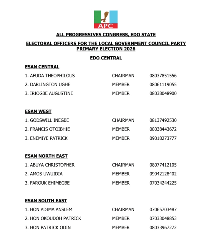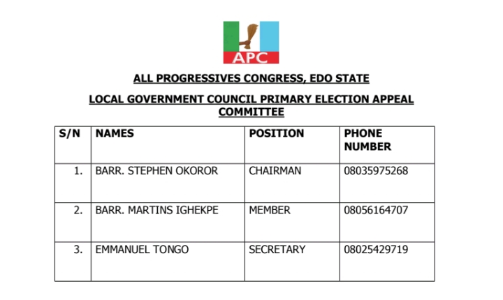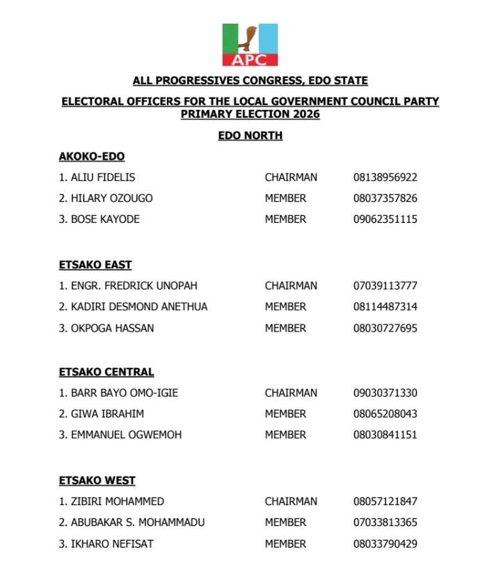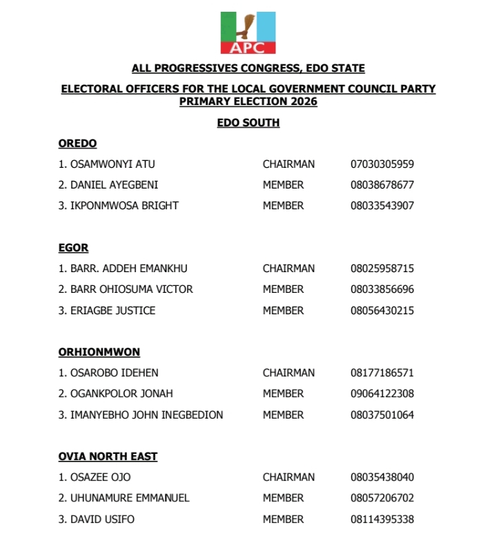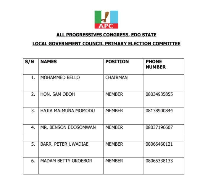 The All Progressives Congress, (APC) Edo State chapter has inaugurated a 3-Man Committee to superintend its council election primary scheduled to hold Friday, 3 April, 2026.
